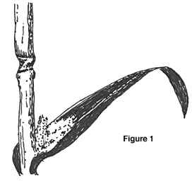 On distingue difficilement les plantules de panic érigé des mauvaises herbes graminées, surtout de la sétaire. Le panic érigé peut être identifié par les poils blancs qui forment une masse à la jonction de la feuille et de la tige (figure 1). La tige est arrondie et habituellement rougeâtre. L'établissement est réussi lorsque 10 à 32 plantules par m2 (1-3 plantules par pi2) sont présentes après l' établissement.