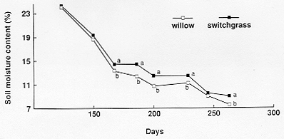 In 1994, a study was performed by REAP-Canada to assess water use on one of the 3 large plantation sites where both switchgrass and willows were growing in monoculture stands (plot size of at least 25 m x 80 m). The study was undertaken at the Ignatius Farm near Guelph, Ontario. This site was chosen because of the uniformity of the SRF willow and switchgrass stands and of the soil across the site. The site was sampled 8 times to a 50-cm depth throughout the growing season to assess differences in soil moisture. Soil moisture levels declined rapidly at this site following the first sampling date in early May and remained low to the last sampling date in late September (Fig 1).