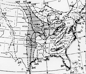 Figure 1. Map of eastern United States showing the ratio of rainfall to evaporation in percentages in different regions; prairie region is the 60 percent to100 percent ratio.