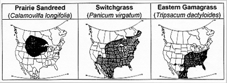 Several other prairie species have also shown potential to produce biomass yields as high or higher than the tallgrass prairie species, particularly outside of the main prairie region. Two of the more promising species are prairie sandreed (Calamovilfa longifolia) and Eastern Gamagrass (Tripsacum dactyloides) which have performed well in biomass trials in the Northern US Great Plains (USDA, 1989) and Southern Illinois respectively (Kaiser, 1989). The native range of these plants compared to that of switchgrass give an indication that they may be as well or better adapted to these particular areas than switchgrass. (Figure 3)
