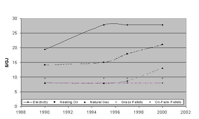 Costs for switchgrass should follow the same trend as stagnant, long-term agricultural commodity prices and remain lower, and fluctuate less, than fossil fuel prices. The incorporation of close coupled gasification technology in pellet stoves produced by Dell Point Technologies enables the combustion of moderately high ash fuels such as switchgrass at efficiencies of 80-85% The cost of heating a 2000 ft2 home with switchgrass pellets using a Dell-Point 34,000 BTU space heater is $1213 compared to $2234, $1664, $882 and $2302 for electricity, heating oil, natural gas and propane, respectively. The development of pellet furnaces with outputs of between 250,000 and 1 million BTUs will make pellet heating systems appropriate for a broad range of structures including farm buildings, livestock barns and greenhouses.