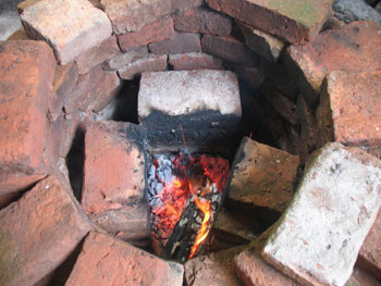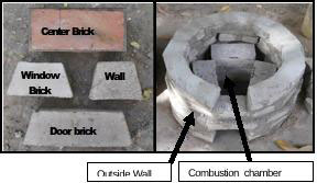 Subsequent prototypes of the Noflay were built in early February 2012 using hand sawn “green clay” or wet unfired bricks and several efforts were made to create custom bricks of various sizes to build the combustion chamber and shroud of the stove. In the end the design that evolved reduced the number of bricks in the top two rows to provide a desired gap between the wall and the cooking pot while also allowing the bottom bricks to have an air gap from the combustion chamber to enable preheating of air. Four entry points for primary air were established and the main entry point was the front fuel loading door. It was designed to use moderately sized fuel wood to minimize cold air entry and prevent excess air problems. The remaining three primary air entry points were placed behind one of the three centre combustion chamber bricks to force air to travel around the bricks and warm prior to entry into the central combustion chamber. The central combustion chamber was built to a height of approximately 20cm to enable the flames to develop sufficiently within the refractory chamber. The secondary air holes were put around the 4th layer of bricks to promote further gas burning and to help air mixing. A fire viewing window was put into the 5th layer to help improve user convenience to manage the fire.